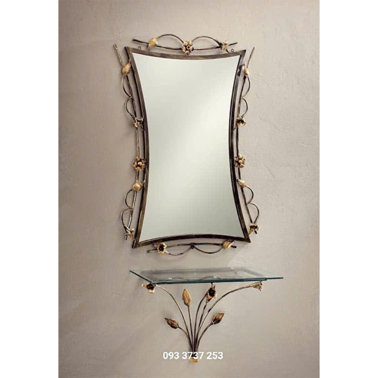 Chất liệu: sắt đặc uốn hoa văn, phụ kiện sắt, mặt bàn kính CL 10mm