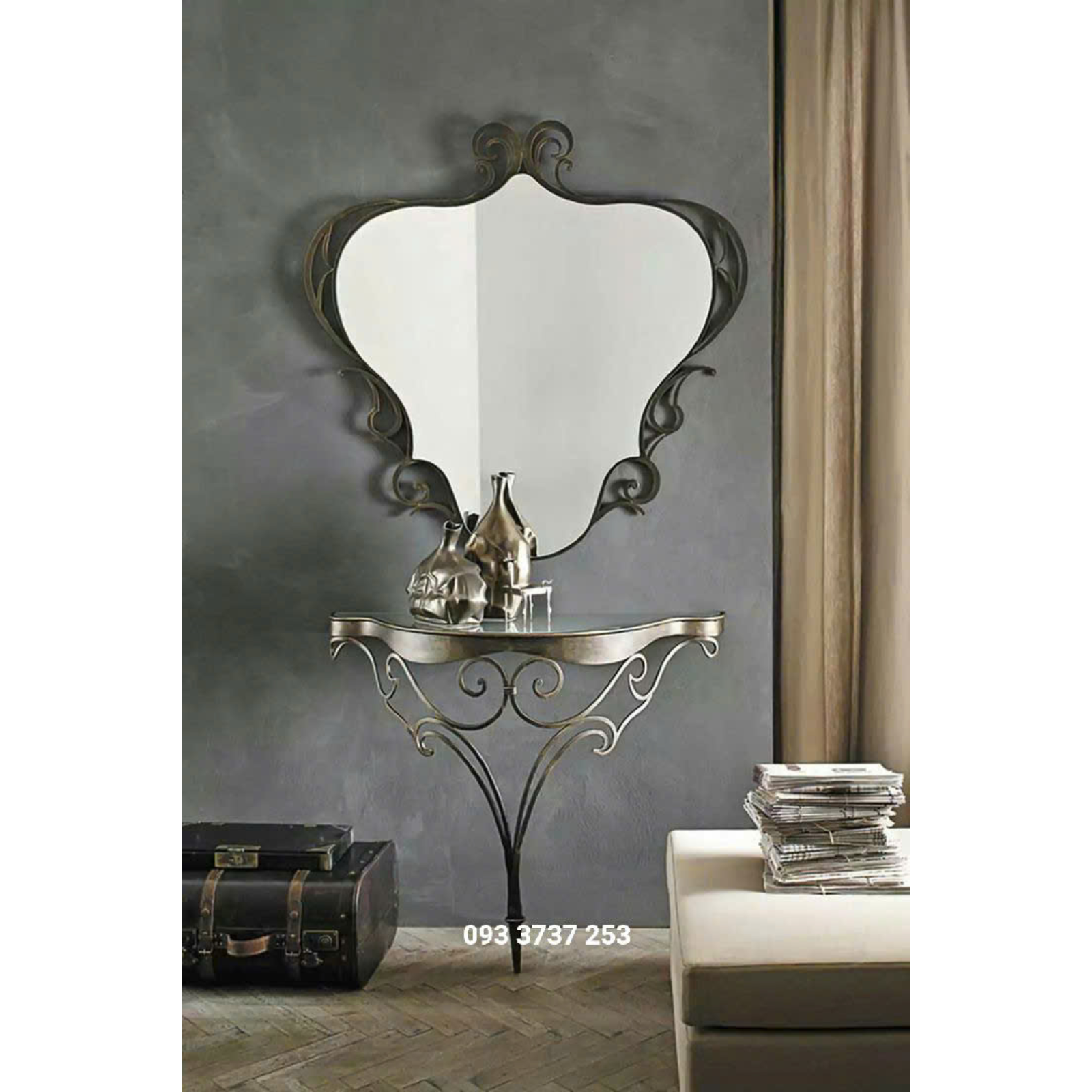 Bàn trang điểm mang phong cách Châu Âu gây ấn tượng với các đường nét sắt uốn mềm mại, hoa văn và kiểu dáng cổ điển thanh lịch. Những chi tiết như chân bàn cong, viền gương uốn đều toát lên vẻ kiêu sa và lôi cuốn đặc trưng của phong cách hoàng gia phương Tây.