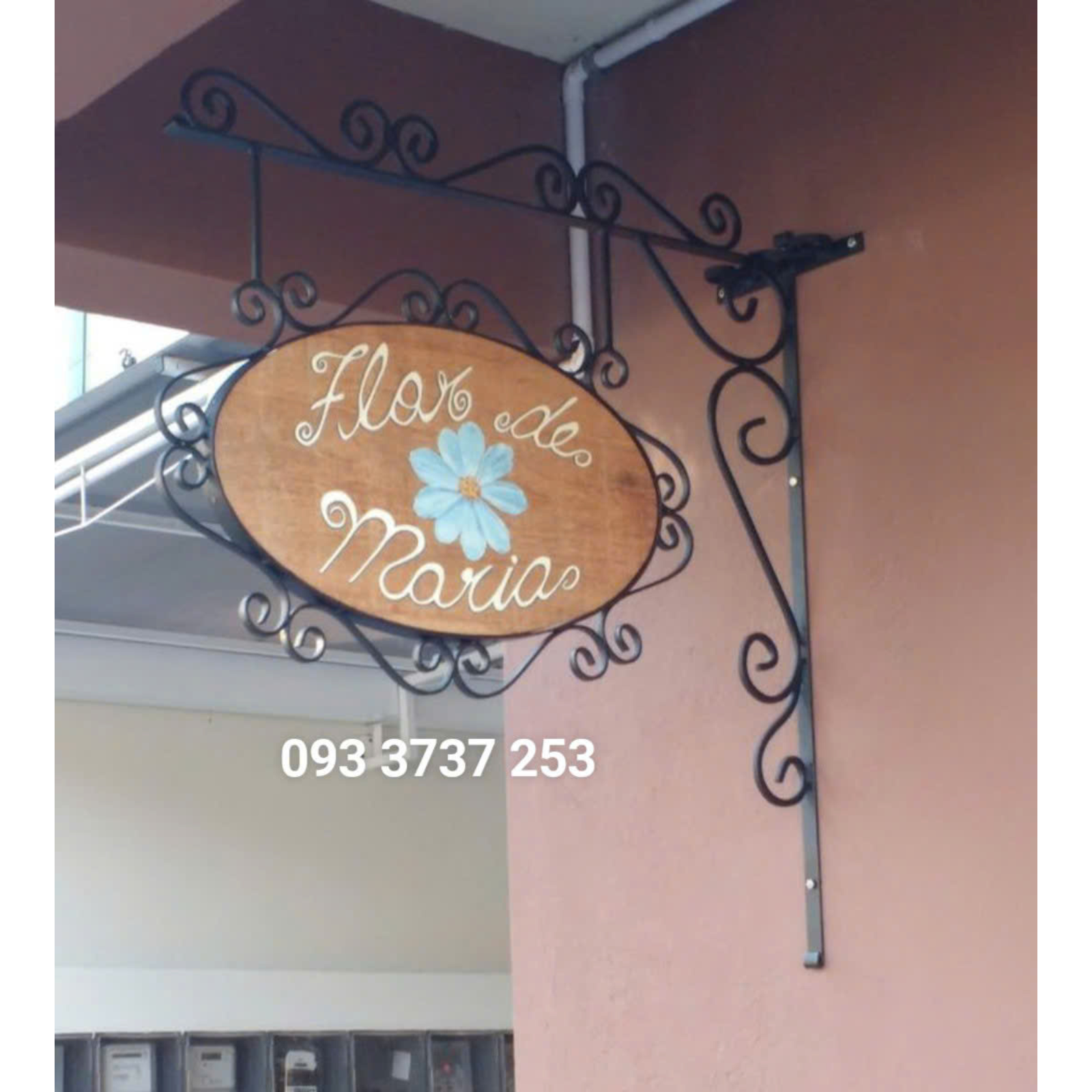 - Sử dụng giá đỡ sắt mỹ thuật với hoa văn tinh tế, kết hợp biển hiệu treo nhẹ nhàng.
