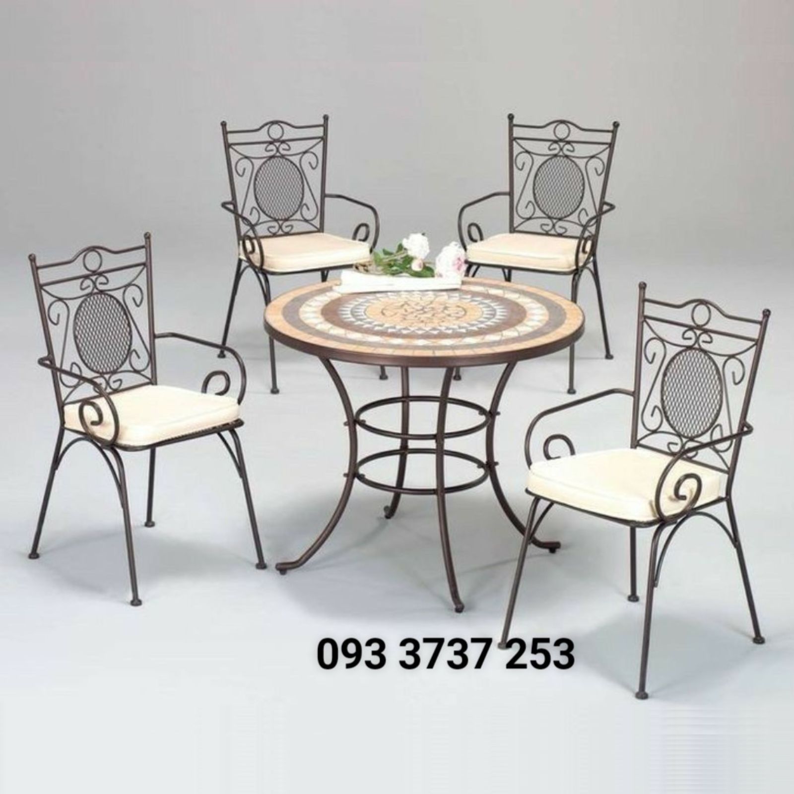 Chất liệu: sắt đặc uốn hoa văn, mặt bàn Mosaic