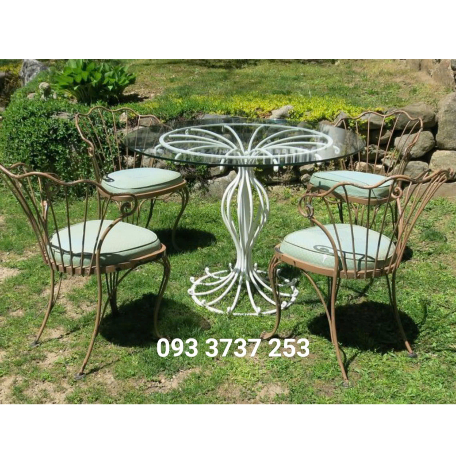 Chất liệu: sắt đặc uốn hoa văn, mặt bàn kính CL, nệm dày 5cm