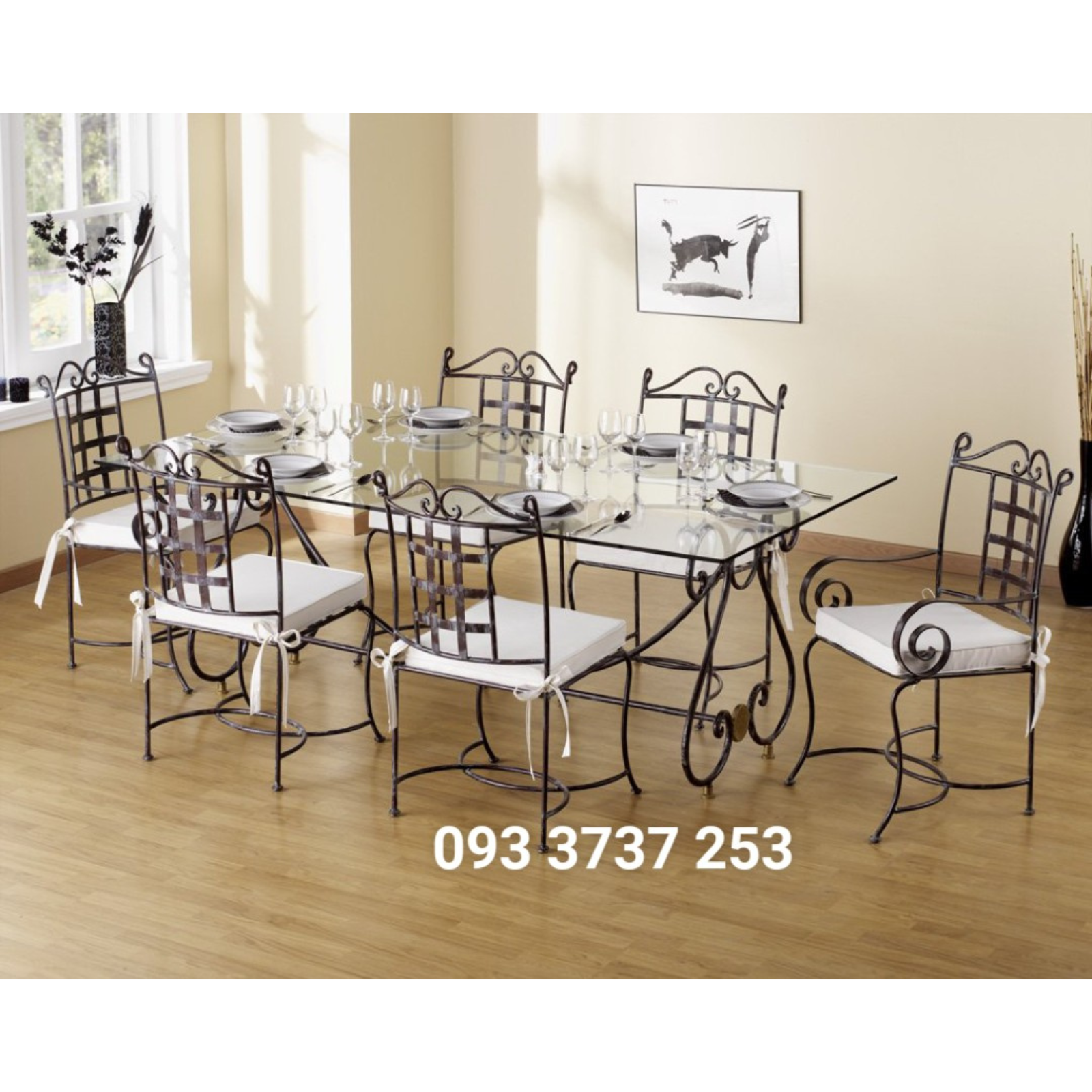 Chất liệu: sắt đặc uốn hoa văn, mặt bàn kính CL 10mm, nệm dày 5cm