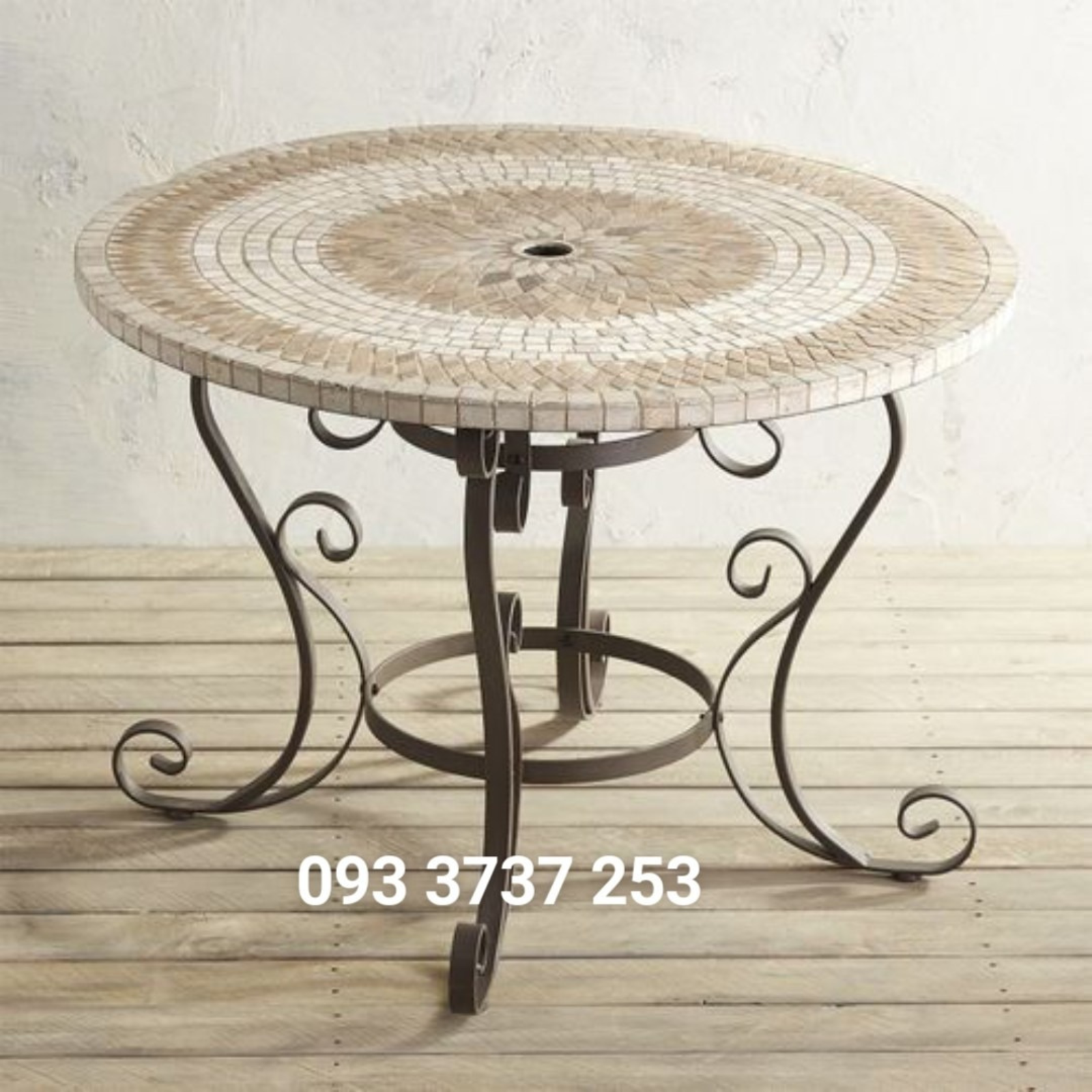 Chất liệu: sắt đặc uốn hoa văn, mặt bàn Mosaic