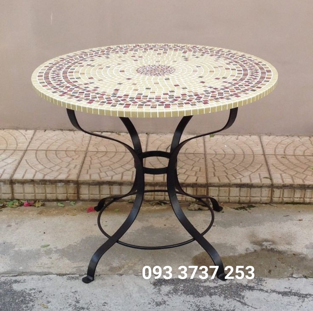 Chất liệu: sắt đặc uốn hoa văn, mặt bàn Mosaic