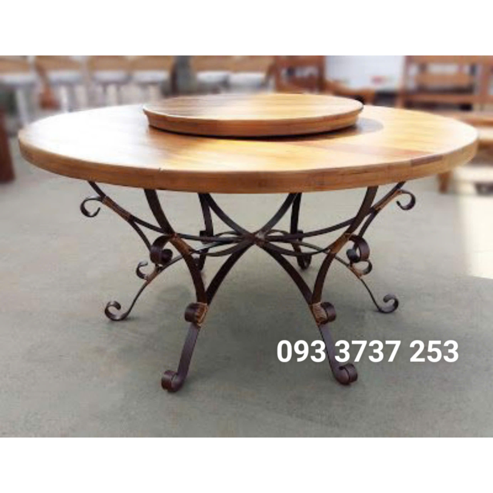 Bàn có 2 tầng, tầng trên có trục xoay tiện dụng giúp mọi người gắp thức ăn một cách dễ dàng. Mặt bàn gỗ kết hợp khung sắt tăng tính ấm cúng cho bữa ăn gia đình. Chân bàn sắt kiểu dáng đẹp, chắc chắn. Chiếc bàn này sẽ làm nổi bật không gian phòng ăn nhà bạn thêm phần sang trọng.