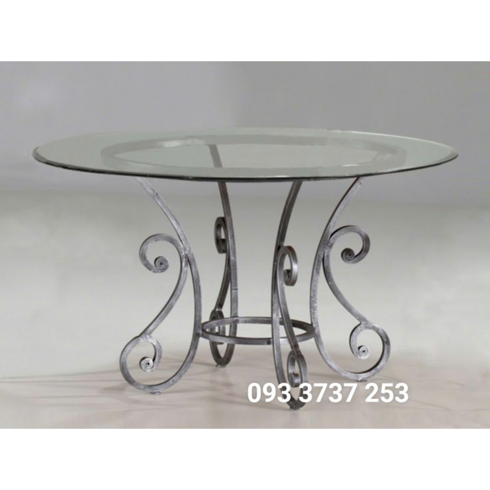 Bàn tròn sắt mỹ thuật, mặt bàn là kính cường lực 10mm trong suốt, vừa tạo vẻ hiện đại vừa dễ dàng vệ sinh hằng ngày. Lớp kính làm nổi bật phần khung chân sắt bên dưới – nơi thể hiện những hoa văn sắt rèn tinh xảo, đầy tính nghệ thuật.