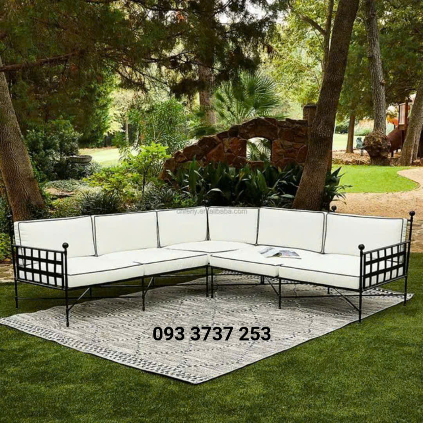 Với biệt thự có sân vườn rộng, sofa L bằng sắt nghệ thuật là một lựa chọn hoàn hảo. Thiết kế thanh lịch hoa văn đan ô vuông tinh xảo kết hợp đệm mềm chống thấm nước giúp cho không gian sân vườn nhà bạn nổi bật, sang trọng và ấn tượng.