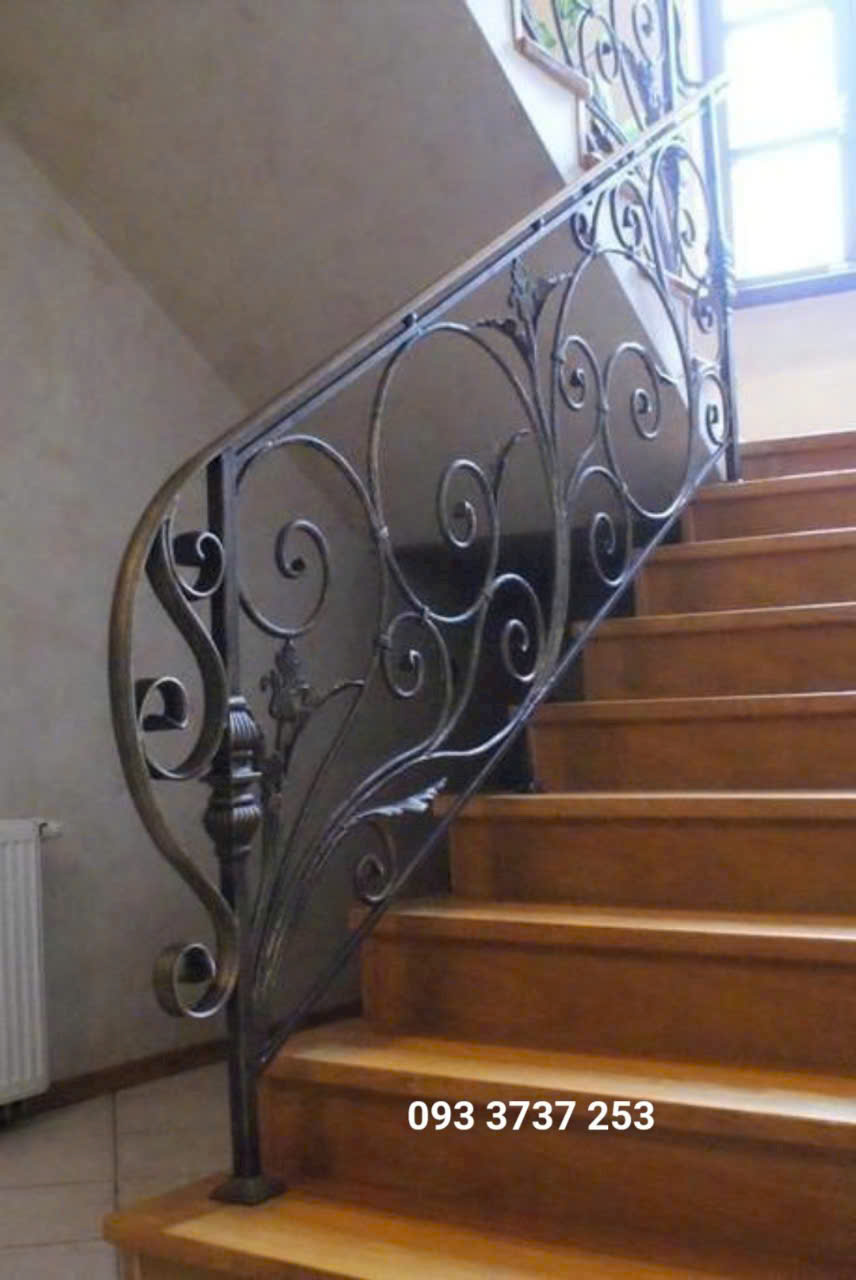 Chất liệu : sắt phi 14,12,8 đặc rèn đầu, viền la 20 x 8 (không kèm tay vịn gỗ) tay vịn la cán cạnh 50 x 8 + phụ kiện