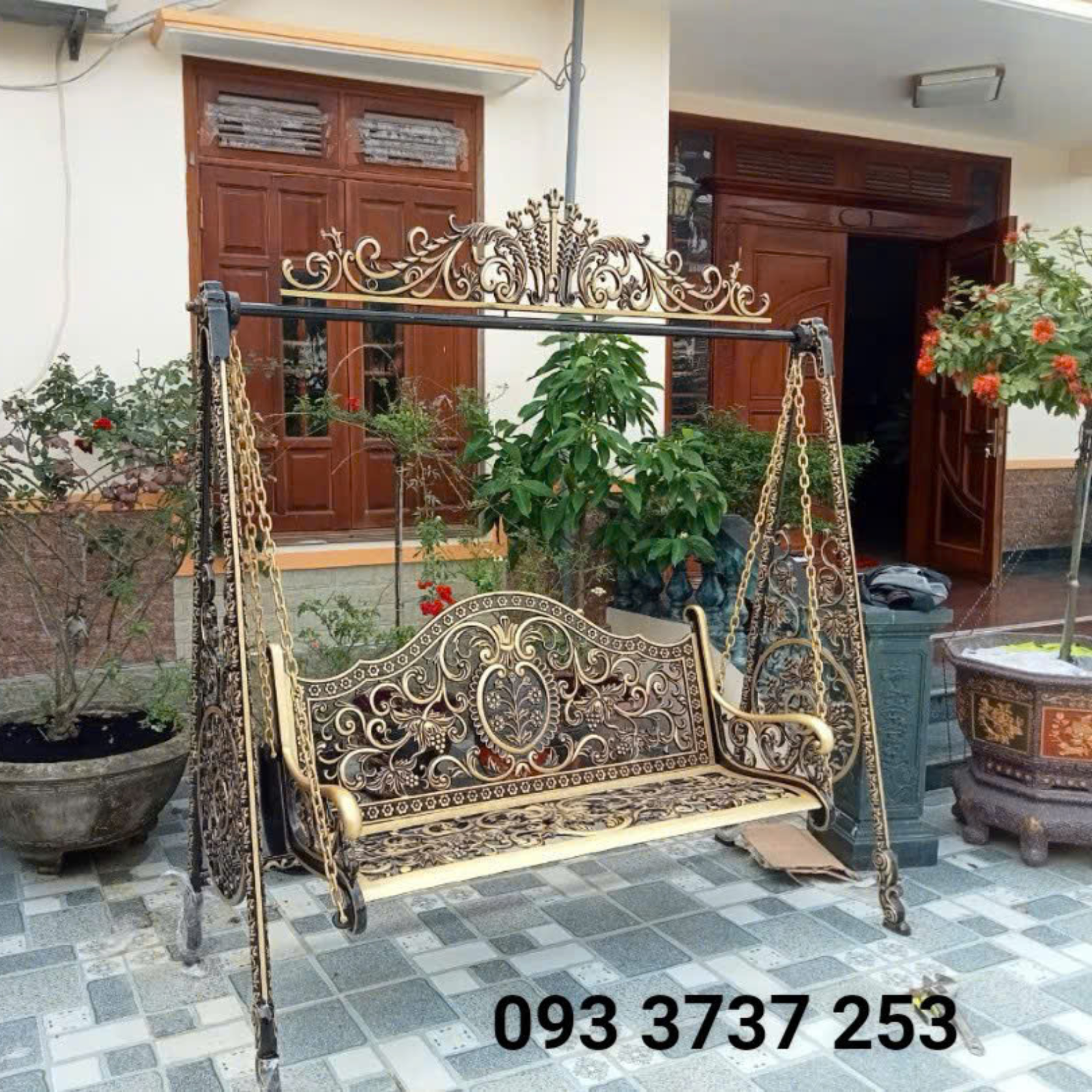 Những đường nét hoa văn tinh tế và màu gam màu đồng sang trọng của xích đu nhôm đúc tạo nên điểm nhấn nổi bật cho không gian ngoại thất. -